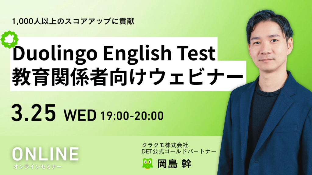 そこで、実際に教育機関へのDuolingo English Test導入を支援しているクラクモ株式会社が、Duolingo English Testに関する教育関係者向けウェビナーを開催いたします。
