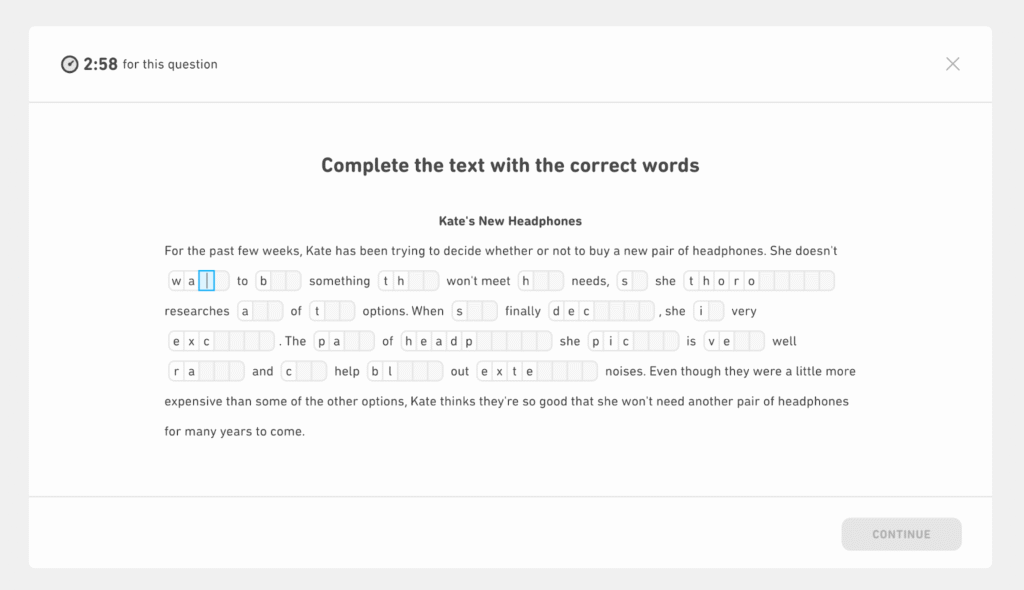 ここからは、Duolingo English Testの主要な問題形式と、それぞれの対策に必要な4技能(リーディング・リスニング・ライティング・スピーキング)スキルを紹介します。